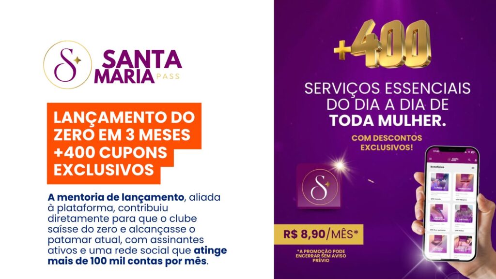 Um exemplo real e recente: o Santa Maria Pass foi lançado do zero e, em apenas 3 meses, já colocou no ar mais de 400 cupons exclusivos, alcançando centenas de assinantes ativos e uma presença digital que atinge mais de 100 mil contas por mês. Por apenas R$ 8,90/mês, oferece descontos em mais de 400 serviços essenciais do dia a dia da mulher, provando que o modelo de assinatura funciona tanto para grandes redes quanto para negócios locais bem estruturados.