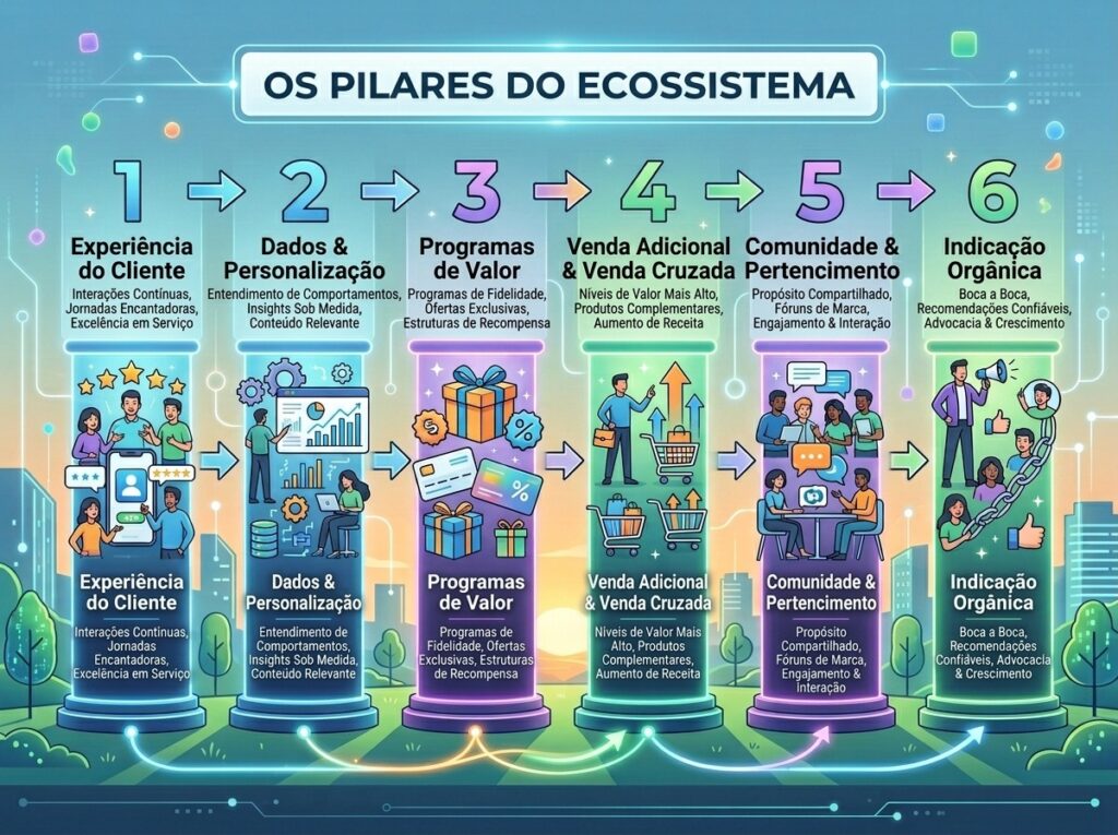 Cada pilar alimenta o próximo. Uma boa experiência gera dados. Dados permitem personalização. Personalização aumenta a relevância. Relevância gera mais compras. Mais compras criam defensores da marca. Defensores atraem novos clientes sem custo de aquisição. O ciclo se auto-sustenta.Os pilares do ecossistema: Experiência do cliente > Dados & personalização > Programas de valor > Upsell & cross-sell > Comunidade & pertencimento > Indicação orgânica.