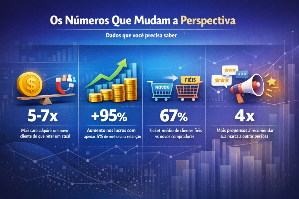 Esses dados vêm de pesquisas da Harvard Business Review, Bain & Company e do trabalho de Philip Kotler sobre custo de aquisição versus retenção. Não são projeções otimistas. São benchmarks consolidados em dezenas de setores.