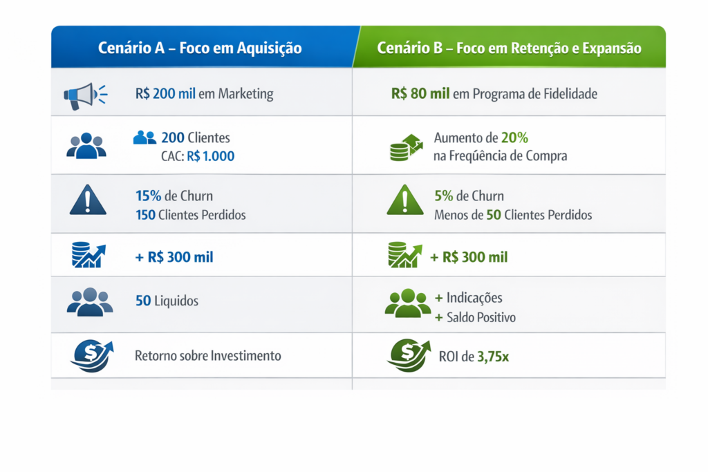 Com R$ 80 mil em programa de fidelidade, você reduz churn para 5% e aumenta frequência de compra em 20%. Resultado: mais R$ 300 mil de receita incremental, menos de 50 clientes perdidos, e uma base que começa a indicar. ROI de 3,75 vezes sobre o investimento.